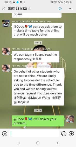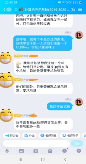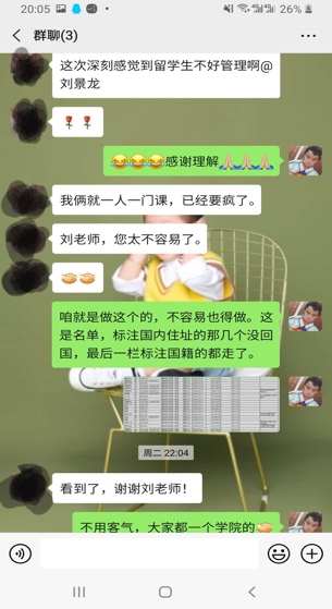 作为公司职工人数最多的公司,如何协调管理公司87名国际员工如期开展网上学习,成为摆在全院师生面前的一项紧迫任务。学习平台皆为中文,国际员工看不懂怎么办?公司87名国际员工,有52人在国外怎么办?境内手机号码在国外无法注册绑定教学平台怎么办?一切难题,只有在实干中才能破解。针对语言困难,公司辅导员刘景龙和任课教师一起,制作英文指南,指导员工平台使用;为解决跨国教学难题,他主动与教务、教师、员工沟通对接,及时了解师生需求,密切掌握员工入驻情况,一对一指导员工注册;《计算机应用基础》这门课全班29个员工只有8人在国内,境外员工无法注册平台,面临无法如期网上开课的问题,刘老师主动找任课教师一起想办法,使得问题得以解决。在师生的共同努力下,公司国际员工基本能如期开展网上学习。居家办公对及时有效地开展工作造成了一定困难,刘老师有时难免着急,但看到家人每天冒着被传染的危险,早出晚归到车站抗疫一线值班,他又不断提醒自己一定要稳住,把工作做扎实。他说:“作为党员,我们必须与大局同频,与时代同步,把工作当事业干,把事业当使命干。我坚信,我们一定能打赢这场抗疫防控阻击战”。