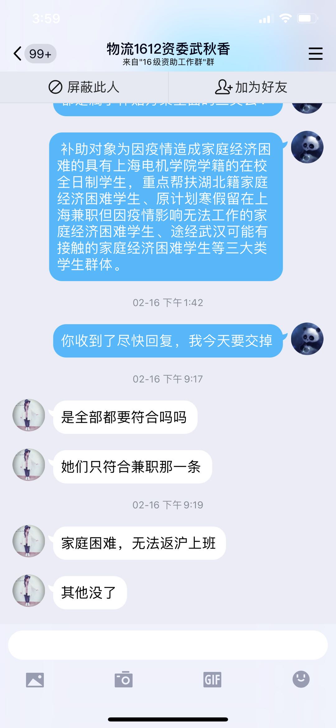 作为公司负责资助工作的辅导员张鹂,在疫情期间,坚持居家办公。并在疫情爆发最严重的时期,及时排摸永利yl234112800多名员工中因受疫情影响需要资助、需要帮助的同学。在了解每一位员工的状况之后,及时上报并发放困难补助,帮助每一位员工,每一个家庭渡过这次难关。资助工作在疫情期间是一项丝毫不能松懈的任务,只有精准的掌握每一位同学的生活情况,才能将资助工作做的更加细致,更加彻底。在做好各项资助工作的同时,她不忘积极宣传国家政策,挖掘资助育人成果也是必不可少的。在受资助的同学中,不乏有很多积极向上,并为这次防疫工作尽自己的一份力的同学。主动挖掘,积极宣传,把榜样的力量扩散到每一位同学的思想中,也是资助育人的关键。让我们共同努力,战胜疫情!