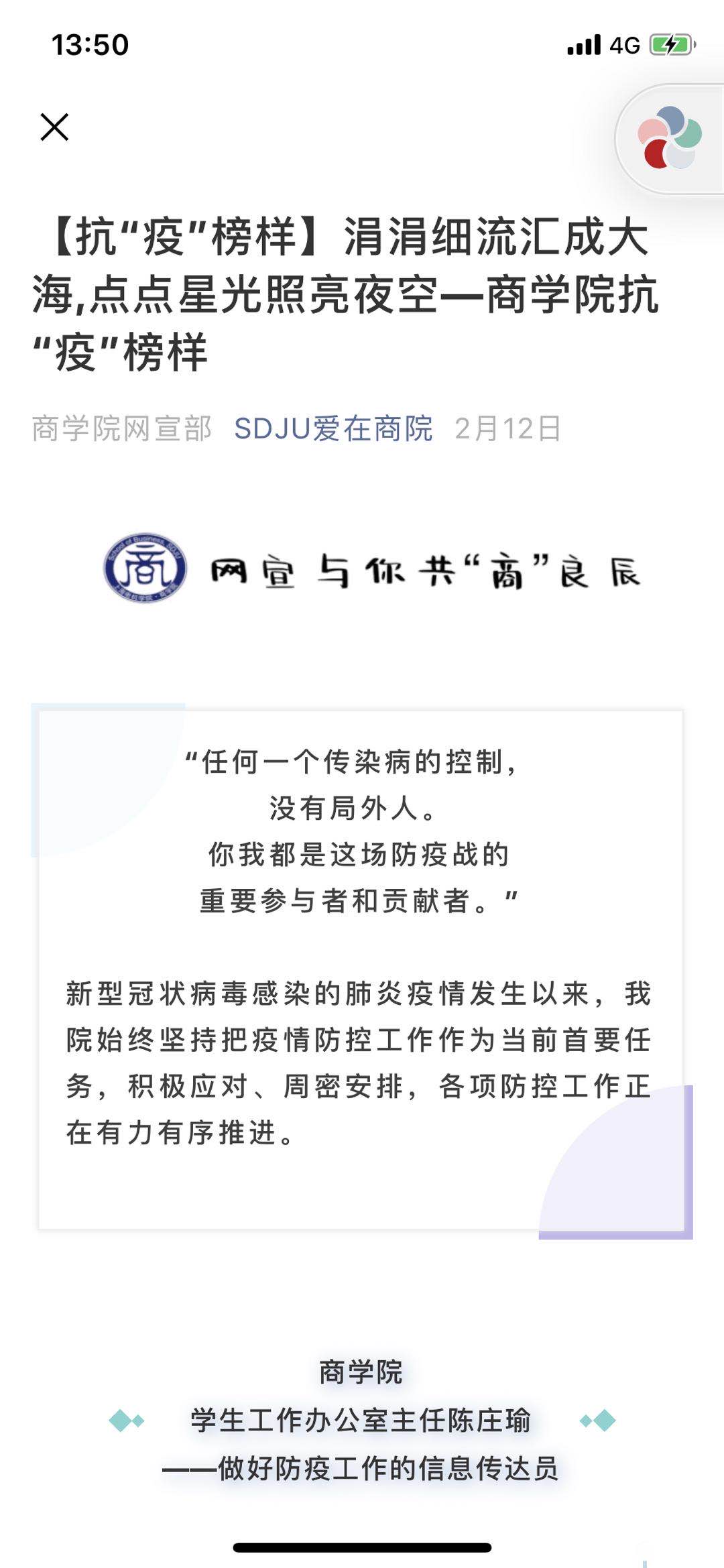 “公司充分利用官网、新媒体平台,发掘员工当中的抗“疫”榜样,转发防疫知识,灵活助力公司疫情防控工作。”辅导员李晴如是说。自疫情爆发以来,为了缓解大家长期“宅”家可能产生的不良情绪,她及时成立公司宣传工作小组,发起战“疫”防控的倡议书,呼吁全体商院学子保持镇定,做好防护,合理规划时间;积极征集身边的抗疫故事,提高舆论引导实效,目前公众号已推送包括毕业党员、退伍士兵、少数民族员工等员工志愿者典型事迹14余例;同时提前策划部署一系列线上活动,征集员工宅家的作品、视频等等,充实同学们的生活;最近线上教学期间,她准备收集更多员工在线学习的反馈,为公司完善线上教学工作提供意见。