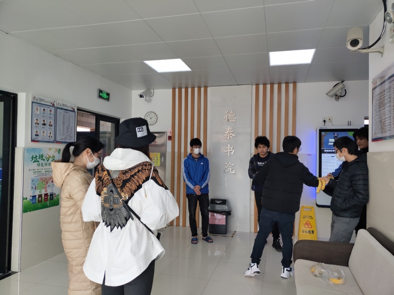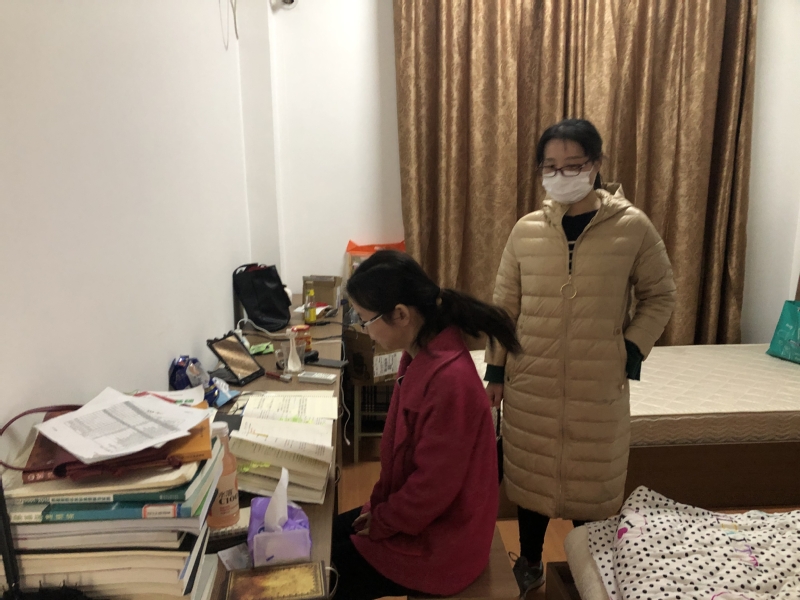 首先,两位老师来到研究生公寓(女生宿舍),逐一到女生寝室了解同员工活情况和留校原因,询问同学们对于留校期间是否遇到什么困难,以及生活上的诉求。关注留校生的心理,并及时给予了建议及疏导。同时就大四同学实习的问题,提出建议解决办法,可以先自己找好工作单位和面试好工作岗位,等疫情过去了,就以正常投入工作生活了。针对留学考试问题,提出可以自己在宿舍学习,由于国外疫情严重,可以缓一年再考虑出国,先实习一年,对出国留学也有一定的帮助。并且,提倡大家趁天气不错时,多多出宿舍到外面操场或者校园活动,同学之间相互交流,多锻炼,养成良好的生活作息。