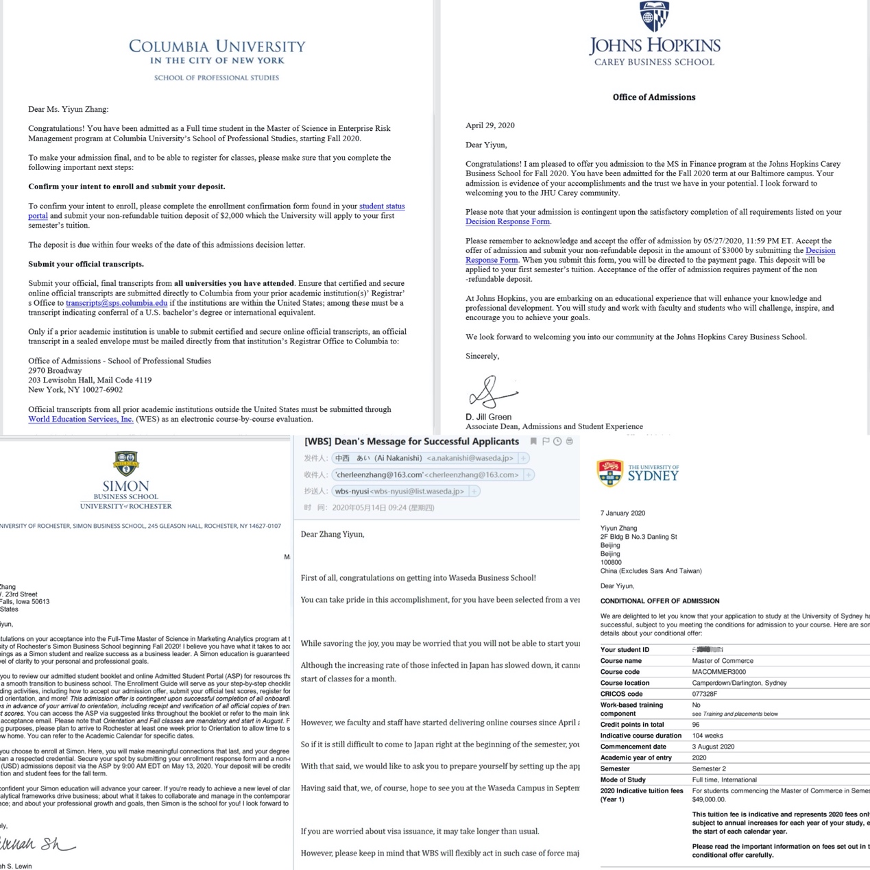 近日顺利从永利yl23411与北爱荷华大学的2+2中外合作项目中毕业的永利yl23411国贸1621班张逸云同学,陆续收到来自美国的哥伦比亚大学,约翰霍布金斯大学,澳洲悉尼大学,日本早稻田大学等国外知名大学的研究生录取通知。一份耕耘,一分收获,追梦路上,她从未停止奋斗的脚步。