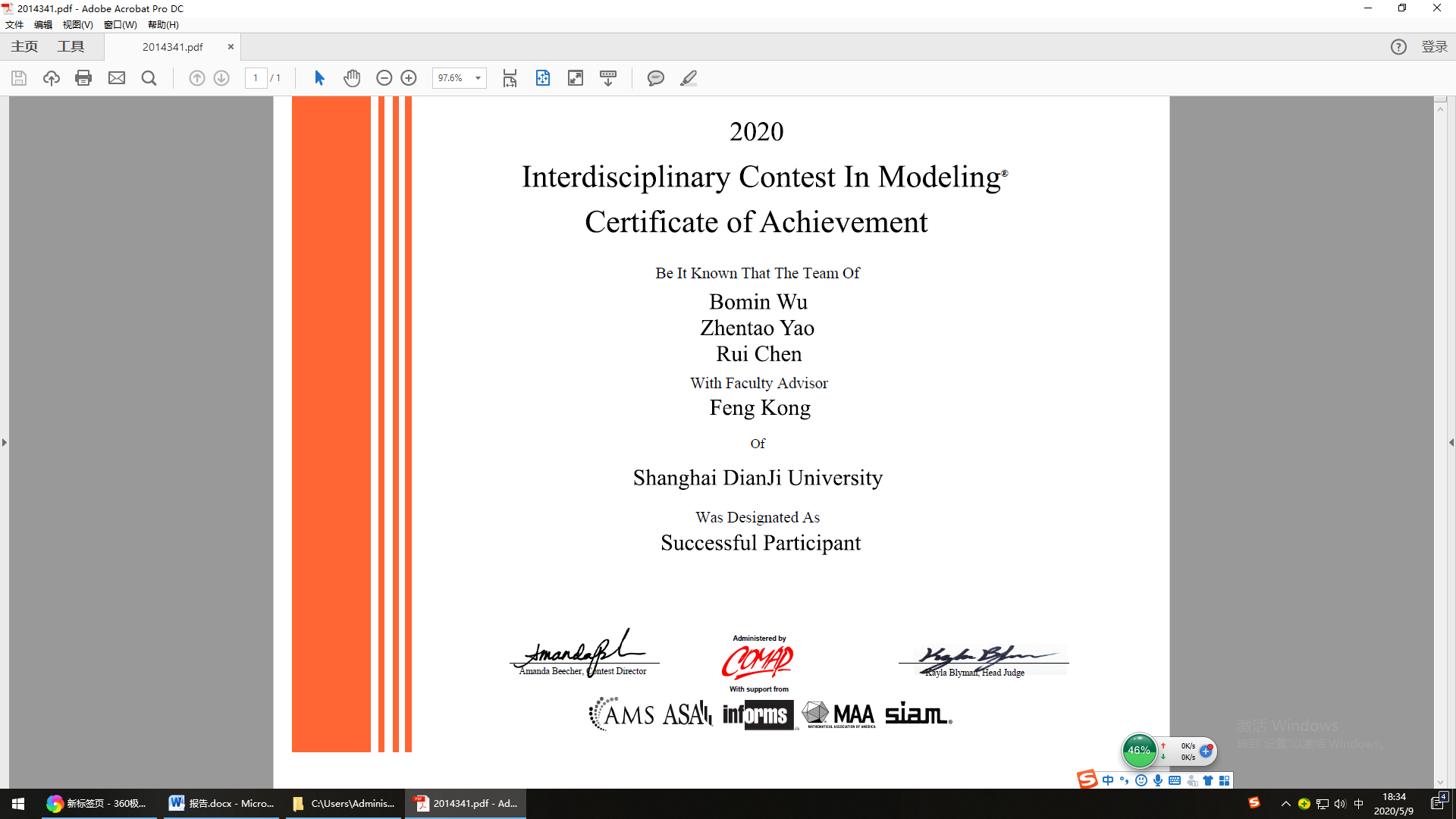 近日,2020年美国老员工数学建模竞赛(MCM/ICM)评审结果正式公布。永利yl23411经济与金融专业吴伯旻、陈蕊两位同学与吉林大学姚振涛同学组队参赛,获得交叉学科(ICM)国际三等奖(S奖),指导教师为永利yl23411孔峰老师。