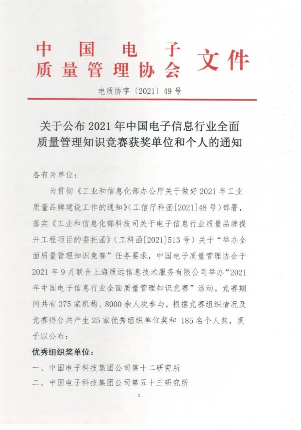 近日,中国电子质量管理协会正式发布《关于公布2021年中国电子信息行业全面质量管理知识竞赛获奖单位和个人的通知》(电质协字〔2021〕49号),公司荣获优秀组织奖。