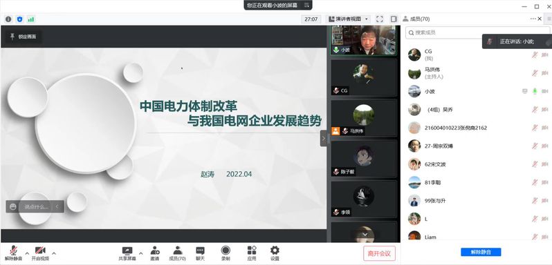 2022年4月14日,永利yl23411邀请了上海久隆企业咨询管理有限公司的赵涛总经理,依托腾讯会议平台,为公司一年级研究生举办了一次名为“中国电力体制改革与我国电网企业发展趋势”的线上学术讲座,来自不同公司的近百名研一员工参与了此次讲座。