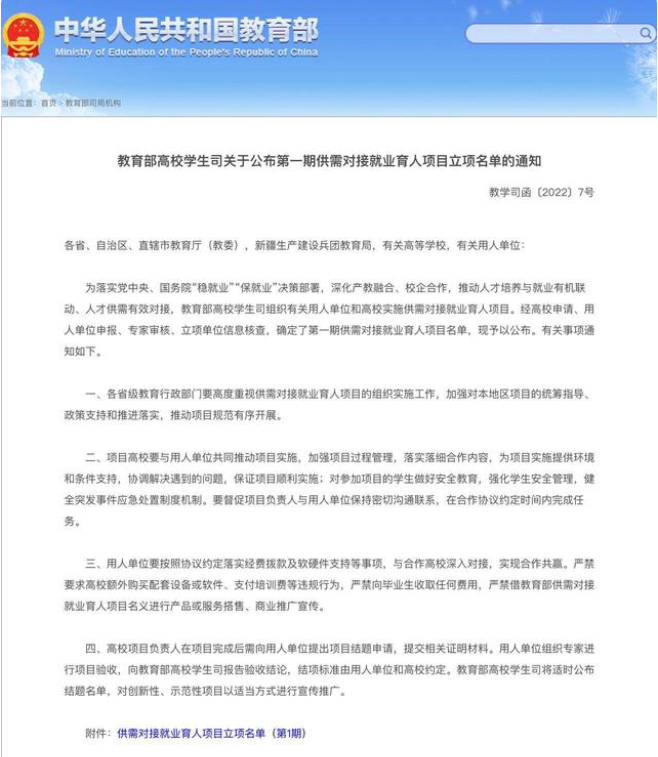 为落实党中央、国务院“稳就业”“保就业”决策部署,深化产教融合、校企合作,推动人才培养与就业有机联动、人才供需有效对接,教育部高校员工司组织有关用人单位和高校实施供需对接就业育人项目,现已确定第一期供需对接就业育人项目名单。公司党委副书记、副经理沈瑾负责的“中国银行股份有限公司上海市分行就业实习基地项目”(20220103227)获批立项。
