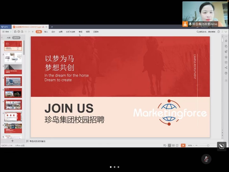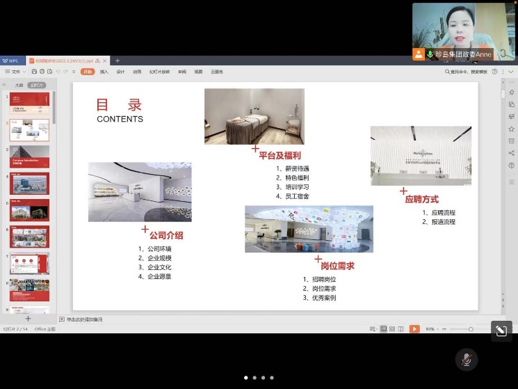 珍岛信息技术(上海)股份有限公司以“以梦为马,梦想共创”为主题,分别介绍了“公司基本信息”、“平台及福利”、“岗位需求”和“应聘方式”。企业代表通过平台,着重介绍有关应聘流程、实业培训等,与毕业生们进行深入的交流和互动。